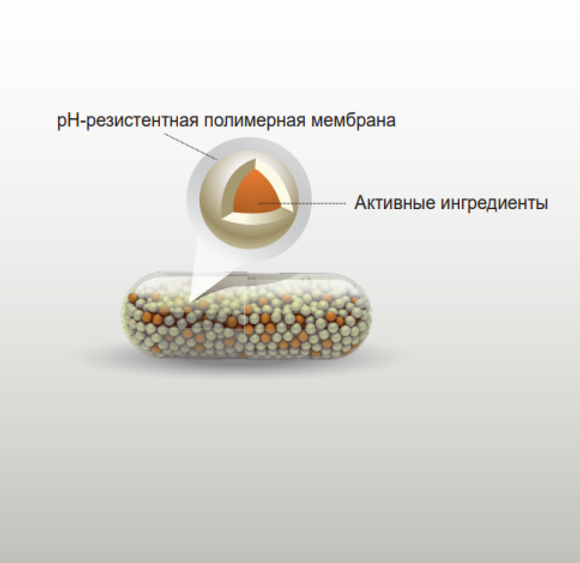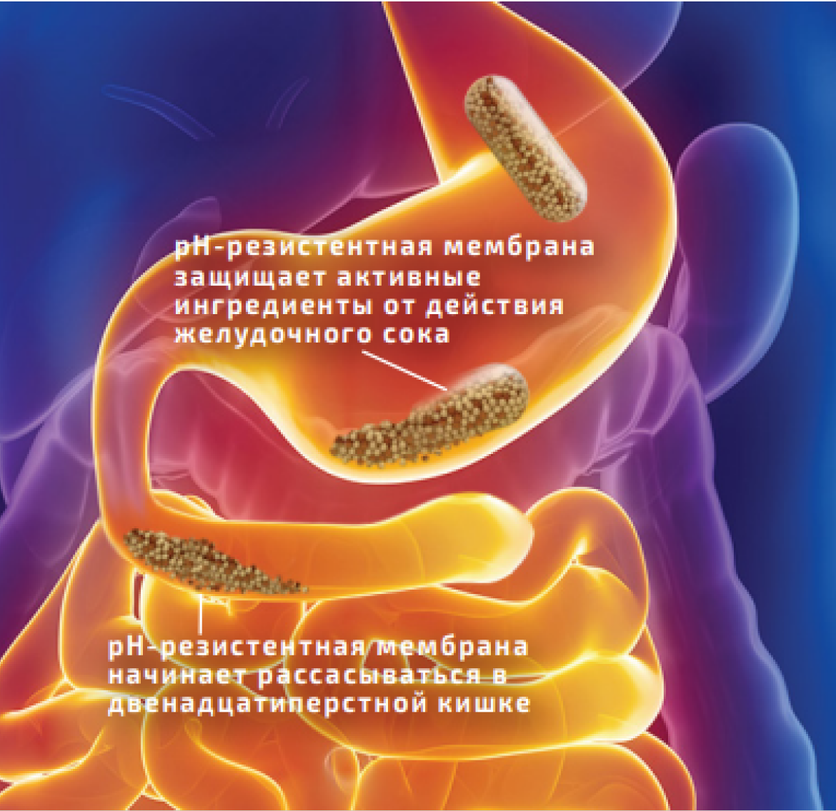 pH-резистентная полимерная мембрана не рассасывается в желудке и обеспечивает защиту активных ингредиентов от повреждающего воздействия агрессивным желудочным соком.
